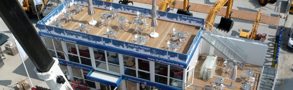 Mit einer Ausstellungsfläche von rund 570.000 qm und etwa 3.500 Ausstellern ist die bauma in München die größte Fachmesse der Welt und internationale Leitmesse für das Baugewerbe. ThyssenKrupp GfT Bautechnik beauftragt uns mit der Konzeption und Umsetzung eines Outdoor-Messestandes.