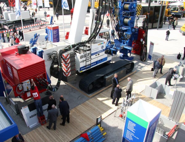 Ein 80 Tonnen schwerer Teleskopkranmäkler für den Spezialtiefbau ragt weithin sichtbar 38 Meter in die Höhe - ein Highlight des Messegeländes.